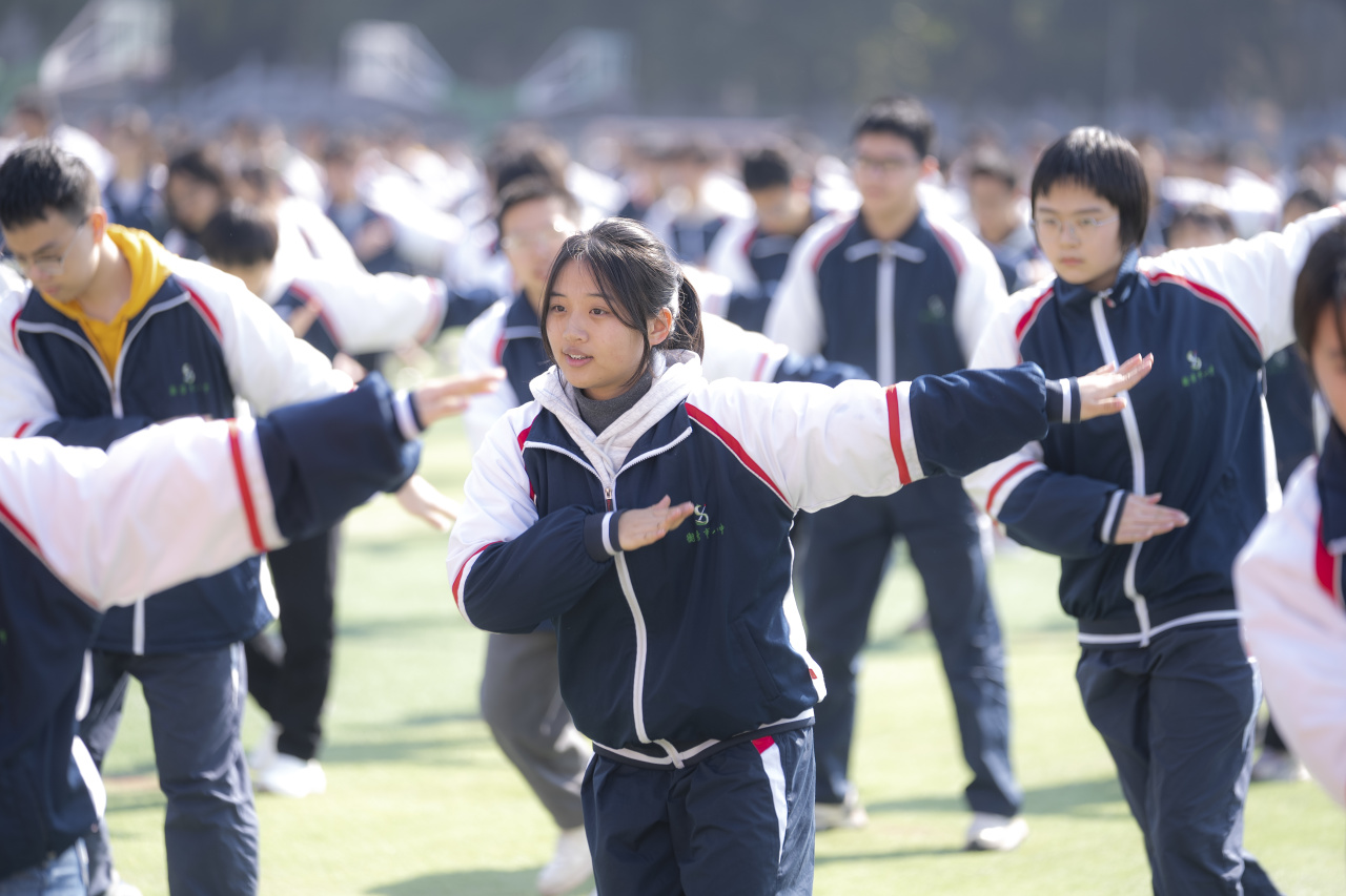 上午 9:30,深大附中一行来到运动场主席台,现场观摩了八中高一、高二学生的排舞展演。两千余名学生身着统一校服,在动感的音乐中整齐划一地变换队形,舒展的舞姿与青春的笑容交相辉映,展现出八中学子蓬勃向上的精神风貌,赢得深大附中一行点赞!