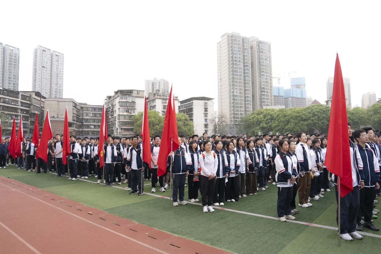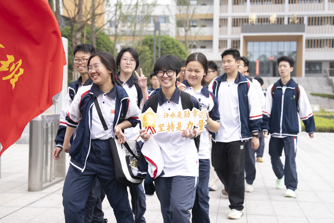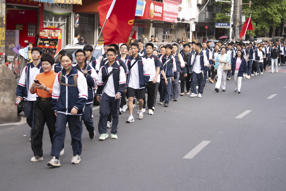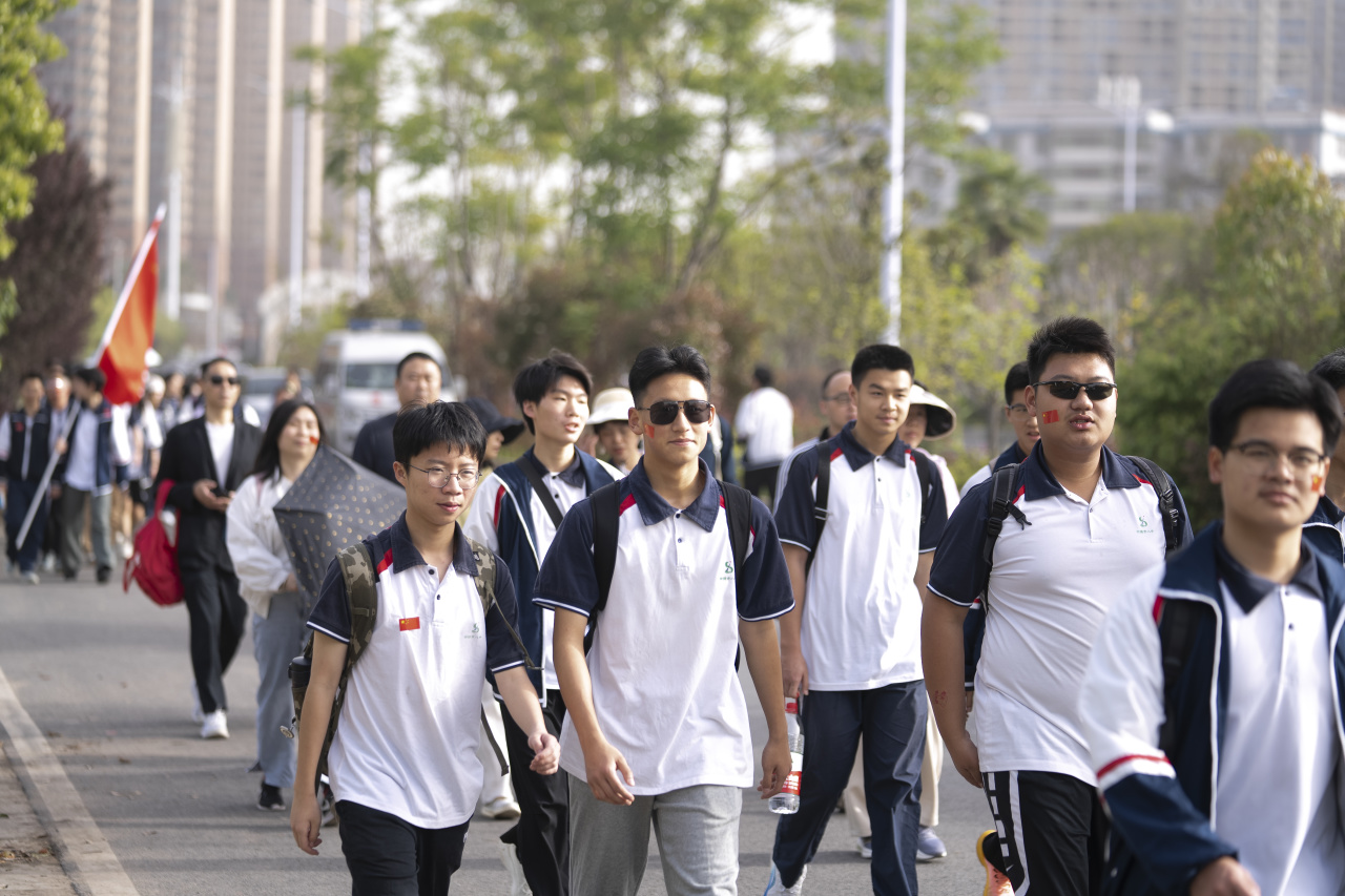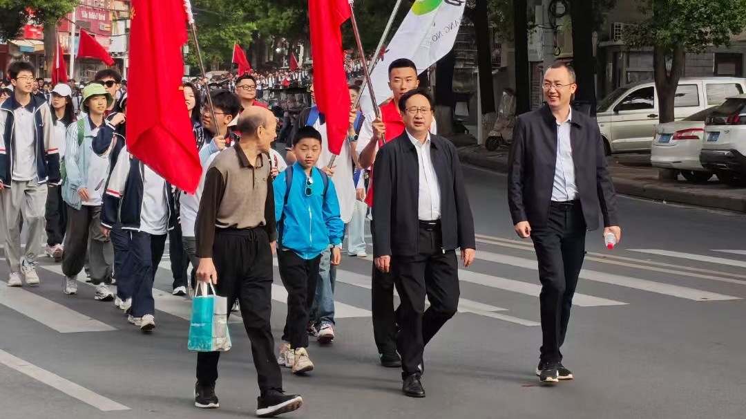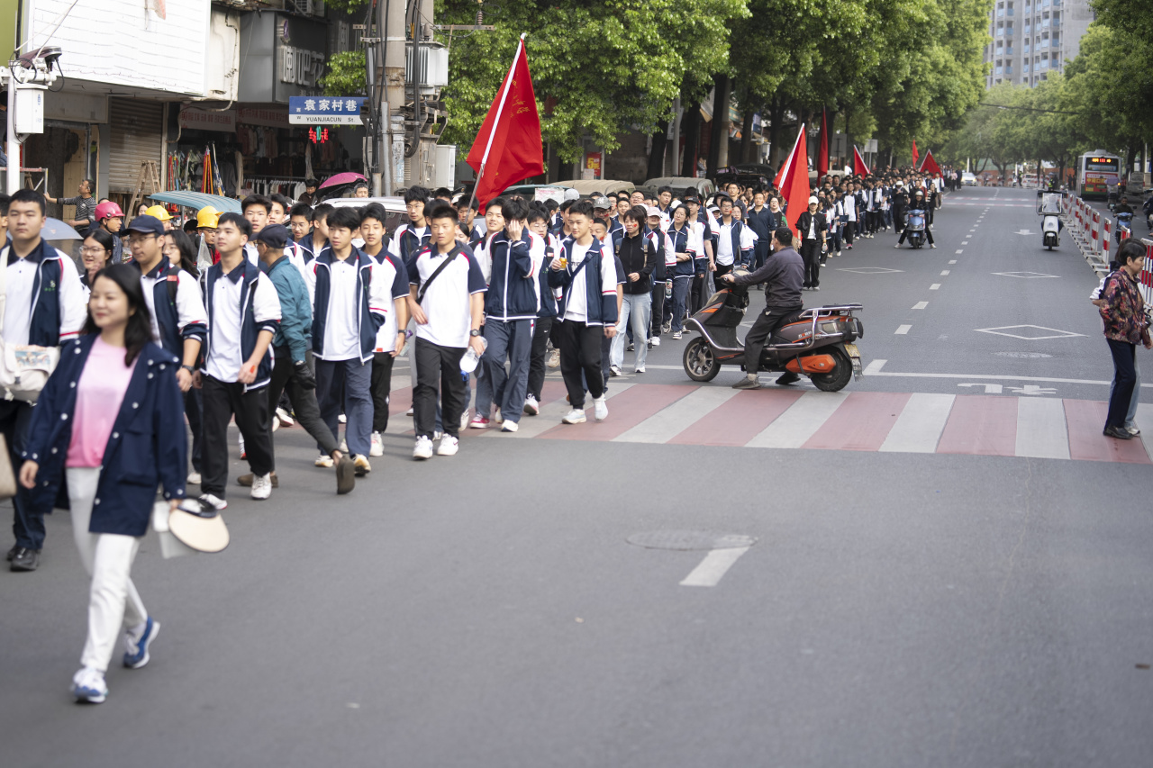 在出征仪式上,唐志军作动员讲话,宁中平宣布出征,21面班旗迎风招展,1100余名师生组成的浩荡队伍沿黄白路、东二环、南二环挺进,在雁城春日里勾勒出一道跃动的红色风景线。