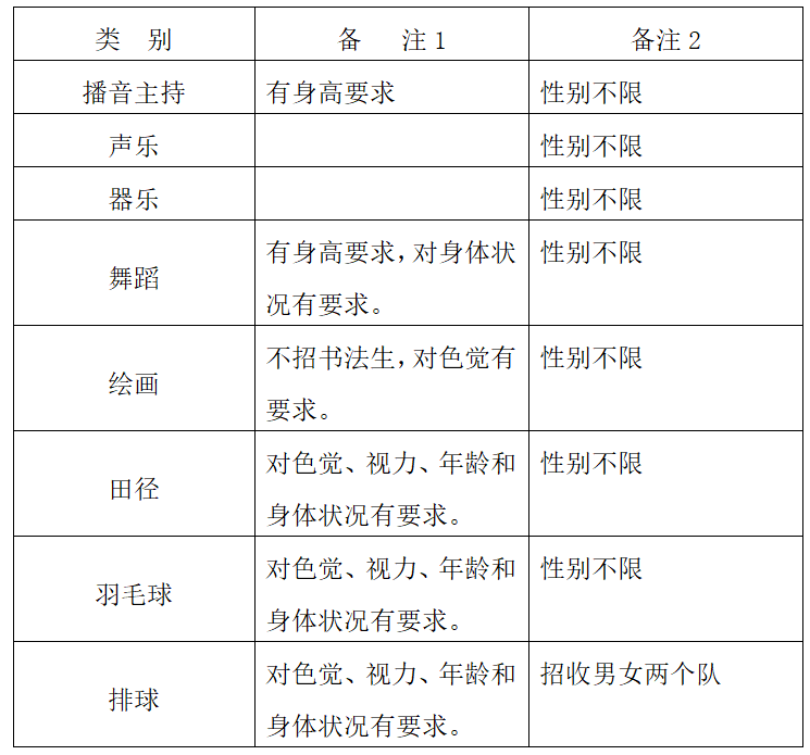音乐类:舞蹈、声乐、器乐、播音主持。舞蹈主招古典舞、民族民间舞。