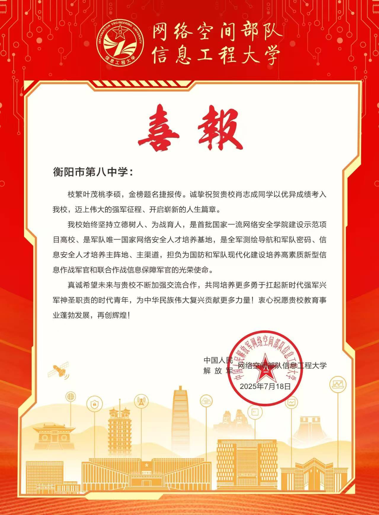 网络空间部队信息工程大学向八中发来喜报 来源: 发布时间:2025-07-25 14:50:43 浏览次数: 次 【字体:小 大】 衡阳市第八中学 「高校贺信」专栏编辑:刘威责编:唐玉瑞三审:高开德顾问:宁中平、唐志军 终审:刘威 分享到: 打印正文