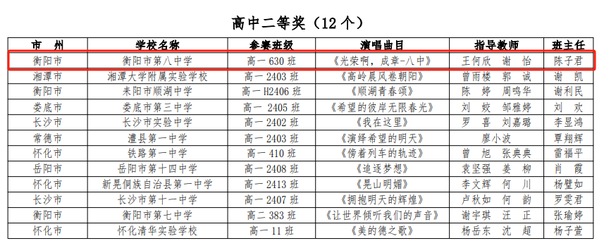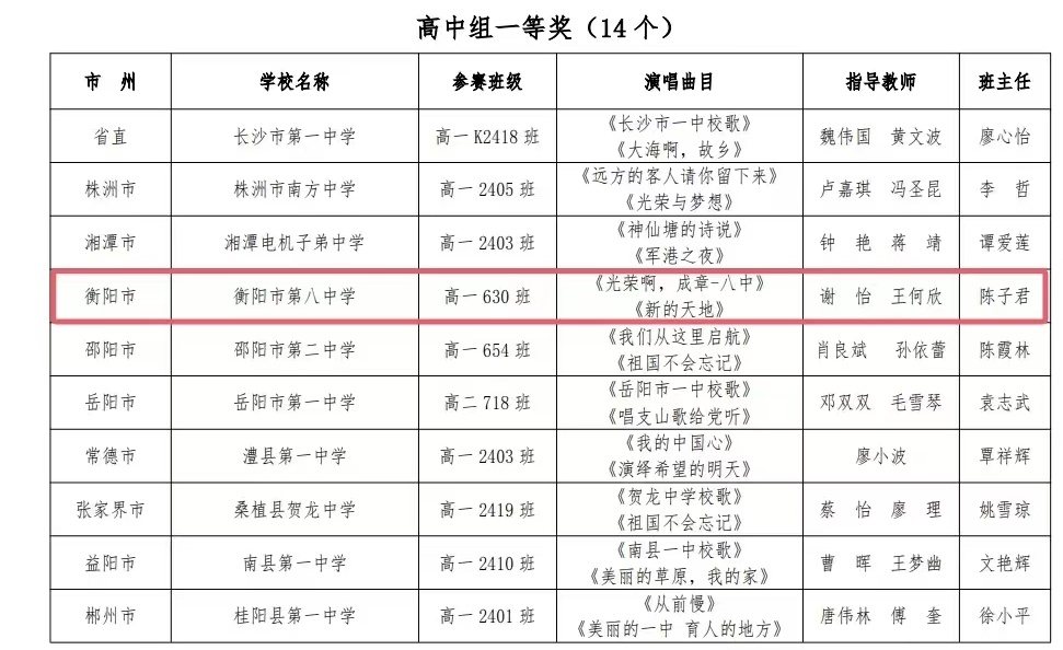 喜报 衡阳市八中在湖南省第十届中小学生建制班合唱暨校歌比赛中分获一等奖、二等奖
