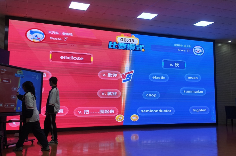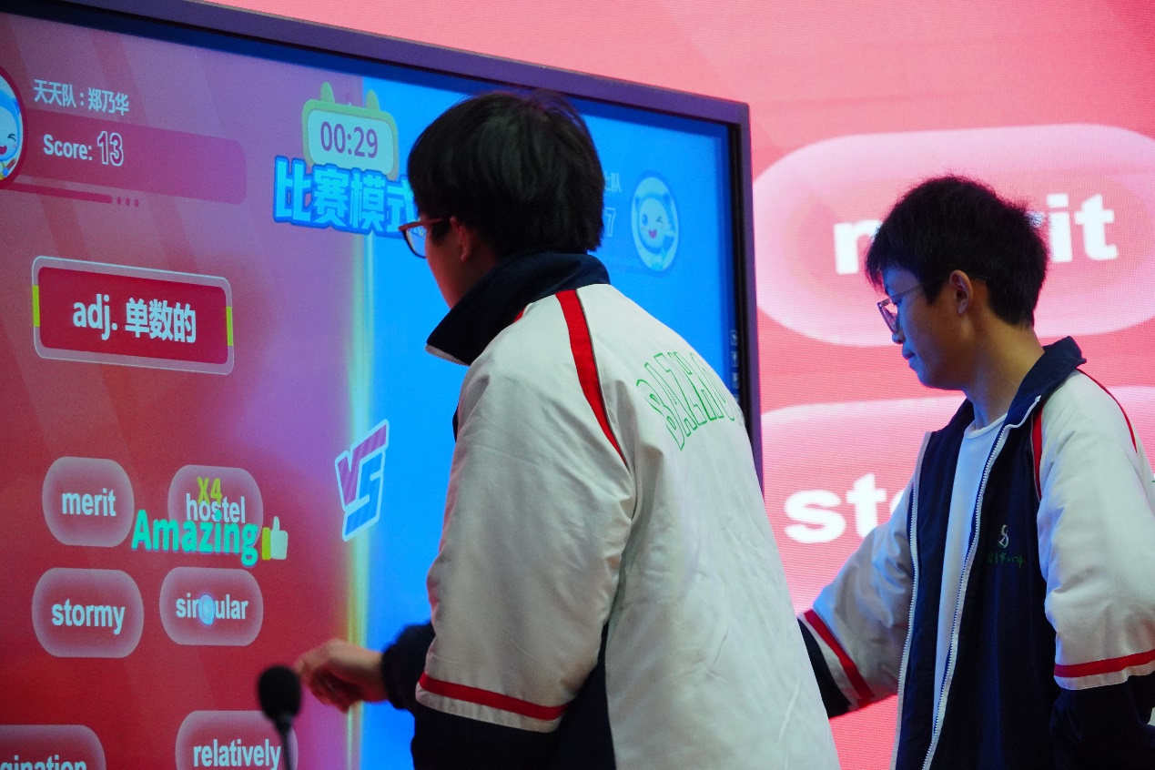 随即,决赛正式开始。首先进行的是个人赛环节,依照赛制规定,学生随机分为两两一组,同时上台,将中文含义与相应的英文单词准确匹配。这一阶段是对学生们词汇掌握程度的严格检验,同时挑战他们集中注意力和快速反应的能力。