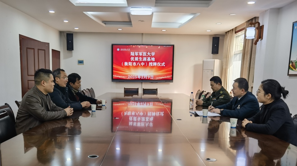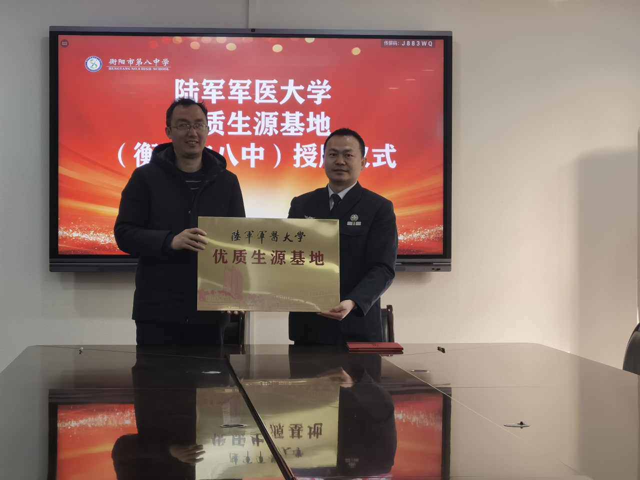 2月9日,陆军军医大学与衡阳市第八中学举行"优质生源基地"授牌仪式。陆军军医大学第二附属医院医务处副处长周建云一行莅临衡阳八中,双方签署共建协议并开展招生宣讲活动,共绘军地合作育人新蓝图。
