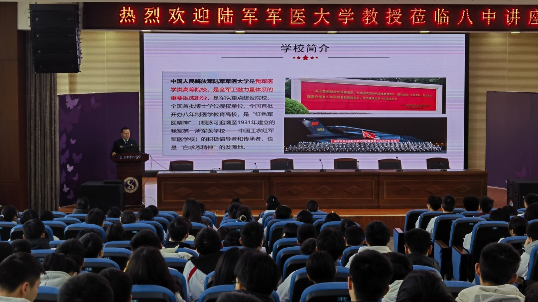 授牌仪式后,周建云在三鹰楼五楼会议室为八中学子作专题宣讲,系统介绍陆军军医大学的办学特色、专业优势及招生政策,激励学生勇担强国强军使命。陆军军医大学专家黄磊则带来《高考心理应对小技巧》专题讲座,结合心理学理论与实战案例,帮助学生科学应对备考压力,获得师生热烈反响。